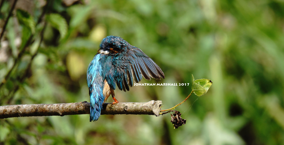 The Kingfisher made a couple more journeys back to the nest with fish and each time repeating the ritual of diving into the water to clean itself after taking the fish to the nest. On the 3rd journey back it spent a lot of time preening itself on the branch after depositing the fish. I was able to get several good photos of this and even managed a short video of the Kingfisher. Once it flew off we decided to eat our lunch whilst waiting for it to return.