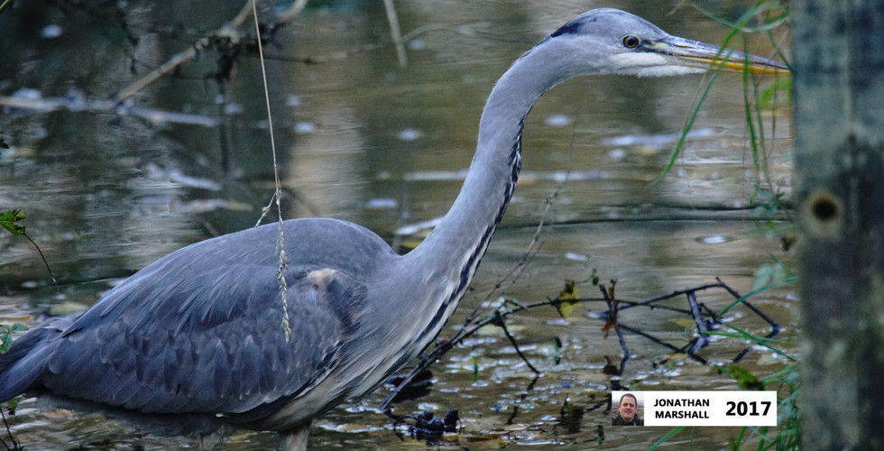 I carried on to the Kingfisher screen and upon my arrival I could see a Grey Heron sat on a fence about fifty feet away on the right hand side. Milling about in the water were a couple of Moorhens but sadly no Kingfisher despite the new perches that had been placed for them. Fifteen minutes later the Grey Heron moved from the fence to the banking at the edge of the water and proceeded to search for fish without success.