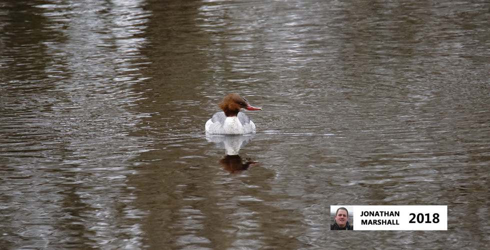 The Long Tailed Tits spent several minutes feeding on the ground before flying off and during this time a Treecreeper landed on the trunk of a large tree. It briefly made its way up the tree before flying off. Further up the river I spotted a male and female Goosander and after a couple of minutes the female Goosander started swimming down the river towards the hide. After a brief pause in front of the hide it continued down the river and out of sight.