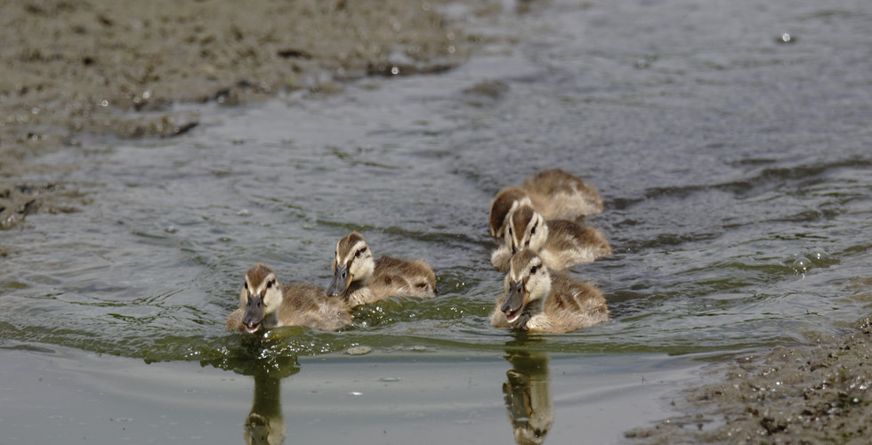 With all the recent dry weather the water levels on the main lake had dropped significantly and there were a few areas of mud now exposed from the water. Another group of chicks now swam down a narrow water channel between mud banks, closely followed by their parents and joined in the battle to get at the food as I headed back to my car.