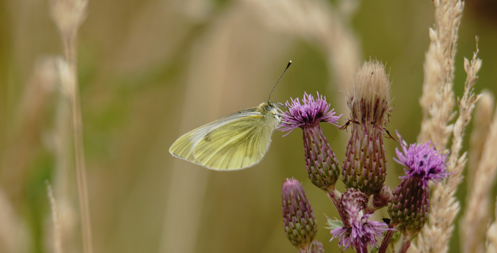 After watching the Spoonbills for a while I headed back along the trail towards the visitor centre, spotting yet more Green Veined White Butterflies, some perching just inches from the path. I walked back through the gate and turned right and followed the path to the Pick Up Hide. To the right of the hide a male Reed Bunting was dropping down from the trees above and then returning to the tops of the trees to feed a young Reed Bunting.