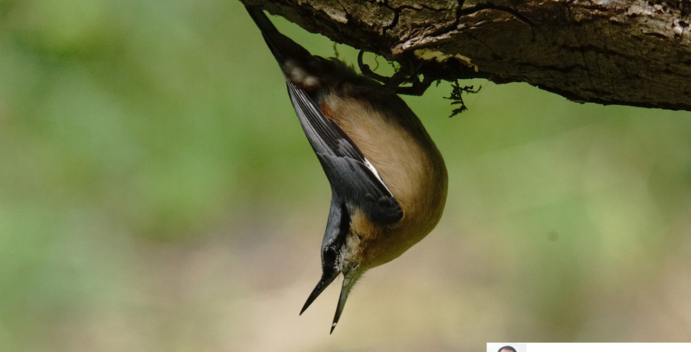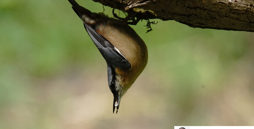 After a few minutes I saw a juvenile as well as a female Bullfinch on the ground in front of the hide. A Nuthatch flew down from the trees and landed on a tree stump in the middle of the logs. The Nuthatch moved over to a log placed between two tree stumps and proceeded to work its way along the underside of the log looking for food, hanging from the log as it went and making sure no other birds were around.