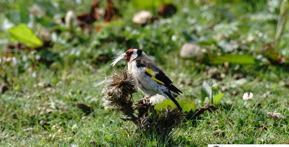 After a few minutes I spotted a pair of Pied Wagtails inching their way along the mud at the water's edge and occasionally wading through the shallow water. A few of the Goldfinches now made more regular visits to the grass in front of the hide, landing on the thistle plants about ten feet away. They spent the next few minutes extracting the seeds from the thistles until all the Lapwings suddenly rose up as one which sent the Goldfinches darting across the grass and into the bushes.