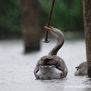 As another rain shower swept threw, around twenty Snipes flew in and landed around a hundred yards to my right. A few of the Snipes made their way over towards the hide, eventually arriving at the mud bank to the right of the hide as the rain got heavier. Two more Snipes flew over and landed right in front of me and after a few minutes the rain stopped, and the sun started to break through the clouds. A few Greylag Geese swam across to the large wooden post with one of them biting at a long steel rod which was protruding from it.