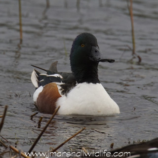 I now followed the Garden Trail round to Lilian's Hide which looks out over a large area of water where I could see Tufted Ducks, Teals, Gadwalls, Wigeons, Mute Swans, Black Headed Gulls and a Little Grebe. After a few minutes I spotted a male Pintail around a hundred and fifty yards away constantly dipping its head under water looking for food. I now headed on to the Lower Trail and the grit trays which attract Bearded Tits and as I walked over a bridge a pair of male Mallards were in the stream just next to me.