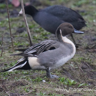 I walked further down the path to where there was a viewing screen looking out over the mere where hundreds of wildfowl such as Mallards, Teals, Wigeons, Shelducks and numerous Pintails further out. Over to my right I noticed a Pintail which was preening itself before it made its way out into the water moving closer along the water. It was almost in front of me before it turned away and headed further out.