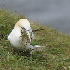 I now continued on towards the final viewpoint and I could see a couple of Skylarks and Meadow Pipits in the field to the left whilst flying along the cliffs to my right were several more Gannets. The last viewpoint is called "Jubilee Corner" and from here I could see large numbers of Gannets, Guillemots, Razorbills and Kittiwakes as well as several Puffins. There were a trio of Puffins together before one was unceremoniously pushed away and one disappeared down a burrow whilst the third stood guard. Another Puffin flew in and landed on a ledge to my left and was looking around moving slowly along the ledge when a second Puffin landed on the cliff a couple of feet above. The Puffins briefly looked at each other before the first one settled down and began to look out to sea. A little lower down the cliff a Gannet was sat on a nest and as it stood up I could see just under its feet an egg, the only one I had seen. There were also large numbers of Gannets, Razorbills, Guillemots and Kittiwakes further along the cliff busily coming and going from their nest sites.